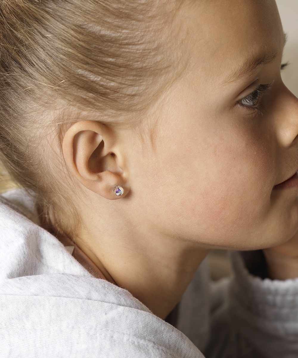 Náušnice vyvinuté ve spolupráci s kožními specialisty, z čistého lékařského plastu s krystaly.