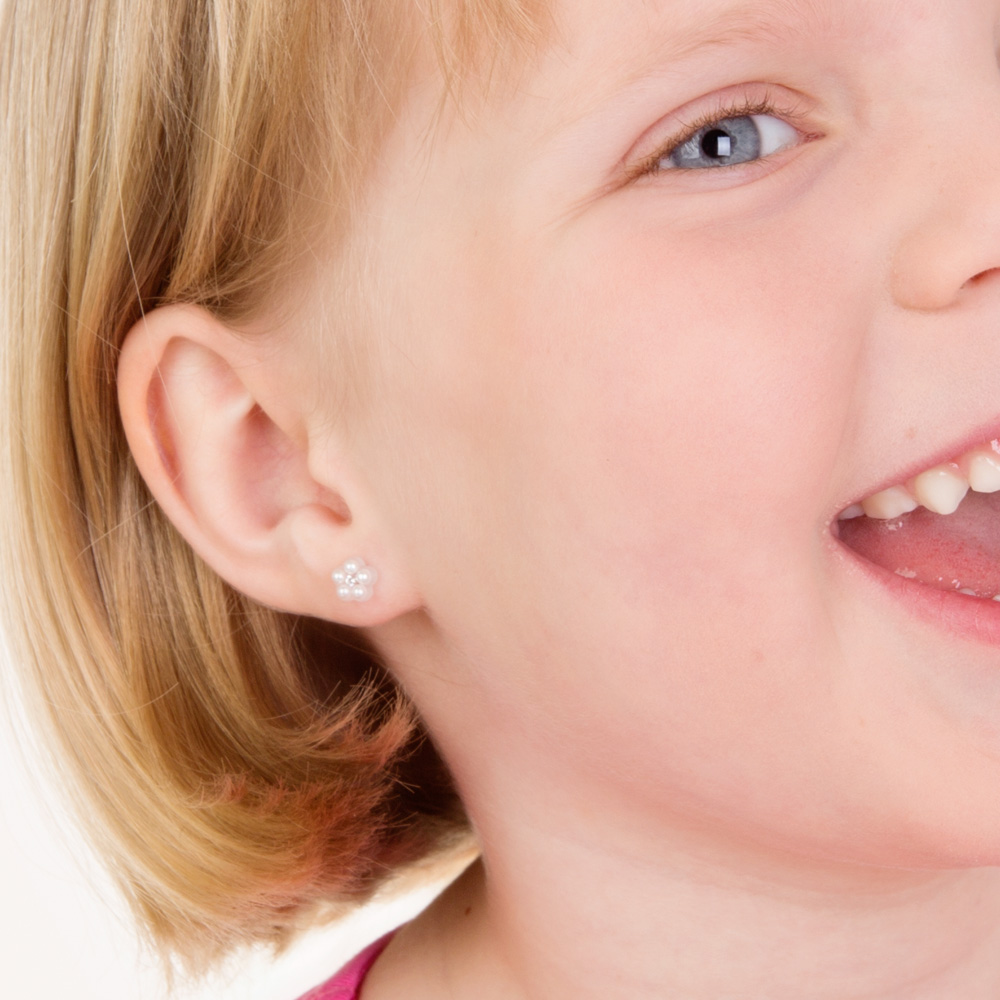 Náušnice vyvinuté ve spolupráci s kožními specialisty, z čistého lékařského plastu s perlou a krystaly.